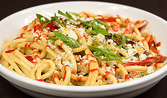 Sausage, Mushroom, Pepper, Zucchini, Squash, Onion, Bucatini, Gorgonzola Cream Sauce, Chili Sauce Drizzle